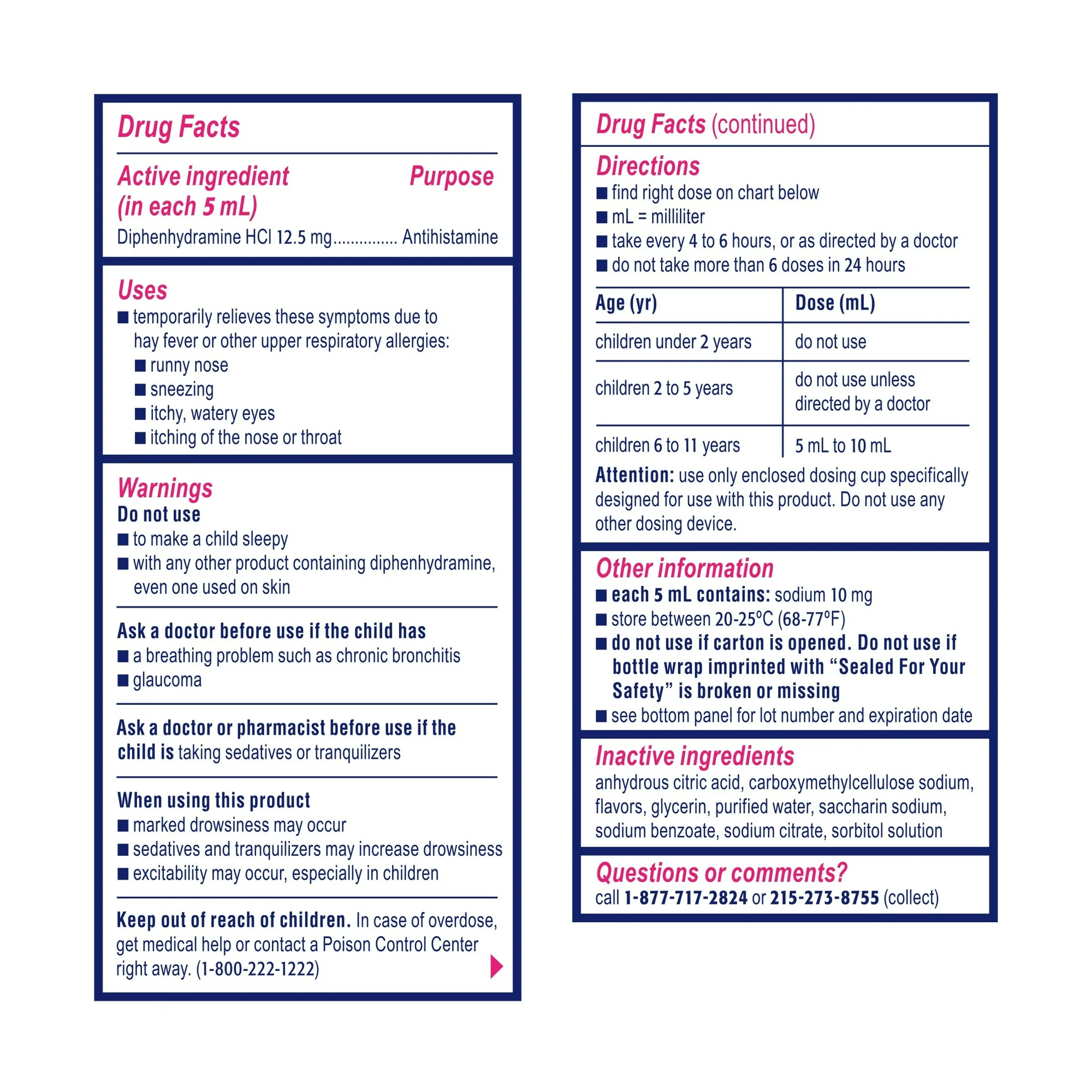 Active ingredient (in each 5 mL): Diphenhydramine HCl 12.5 mg - Antihistamine