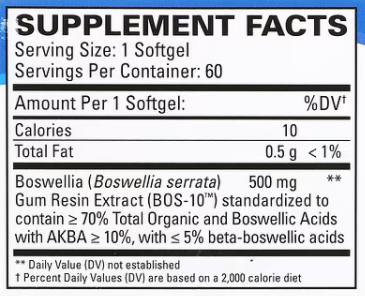 | Gum Resin Extract (BOS-10™) standardized to contain ≥ 70% Total Organic and Boswellic Acids with AKBA ≥ 10%, with ≤ 5% beta-boswellic acids |