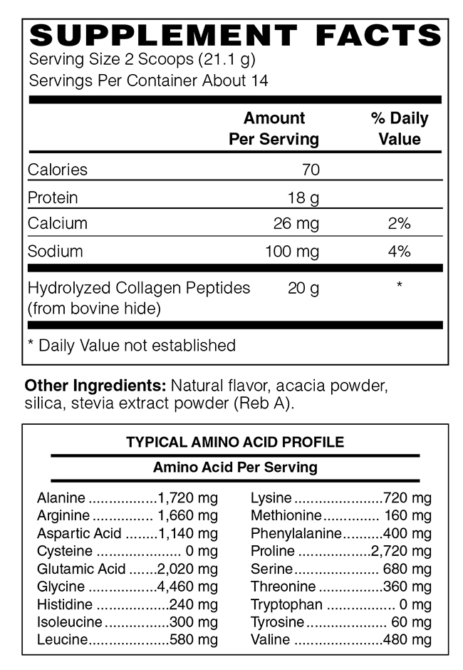 | Hydrolyzed Collagen Peptides (from bovine hide) | 20 g | * |