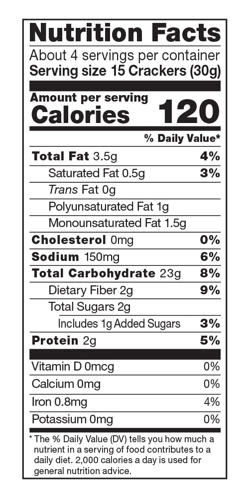 Crunchy, baked crackers with whole grains, seeds and sea salt. Nutritional Info: Low in Saturated Fats, 0g Trans Fat, No Cholesterol Gluten Free Non-GMO Project Verified Kosher Dairy 21g Whole Grain per serving