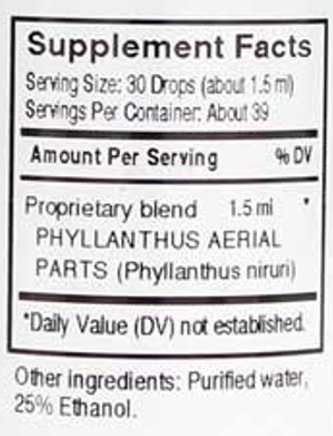 | Proprietary blend PHYLLANTHUS AERIAL PARTS (Phyllanthus niruri) | 1.5 ml | † |