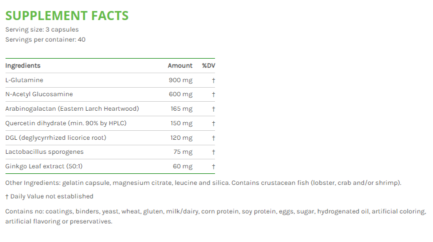 It is recommended to combine this product with Acidophilus/Bifidobacter/FOS for extra support. If necessary, combine with higher doses of Glutamine (Glutamine Powder or Glutamine 850mg).