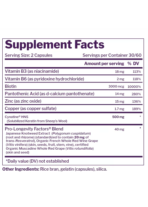 Because keratin doesn’t work alone, it’s loaded with B-vitamins and minerals to support scalp and follicle structure and natural keratin production. And our powerful resveratrol neutralizes free radicals that can disrupt healthy follicles and growth.