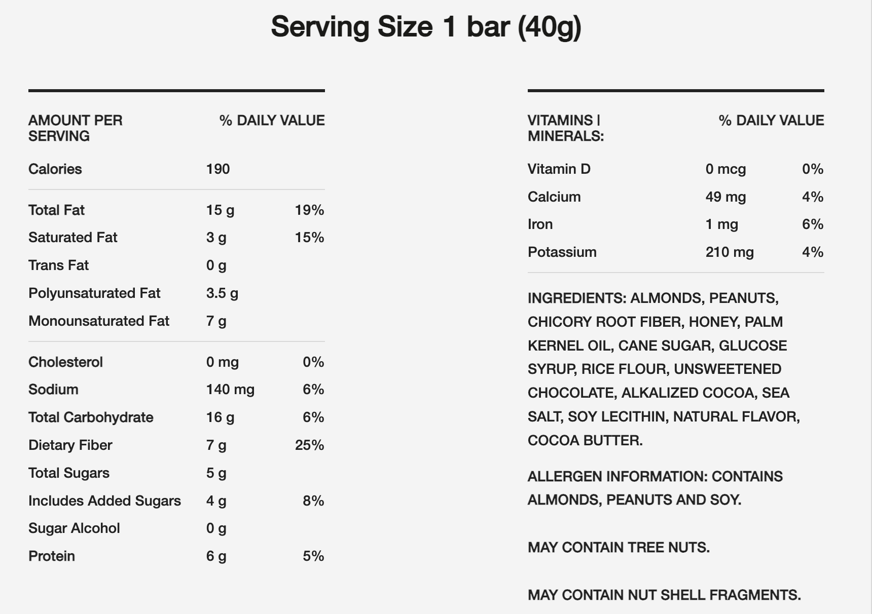 Other ingredients: almonds, peanuts, chicory root fiber, honey, palm kernel oil, cane sugar, glucose syrup, rice flour, unsweetened chocolate, alkalized cocoa, sea salt, soy lecithin, natural flavor, cocoa butter.