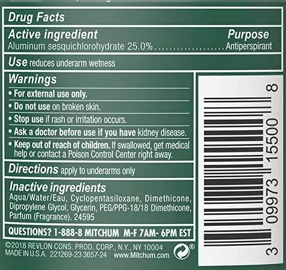 Active ingredient: Aluminum sesquichlorohydrate 25.0%....................................................Antiperspirant