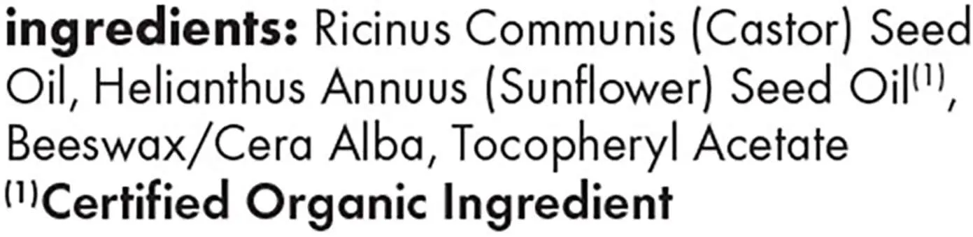 Ingredients: Ricinus Communis (Castor) Seed Oil, Helianthus Annuus (Sunflower) Seed Oil(*), Beeswax/Cera Alba, Tocopheryl Acetate
