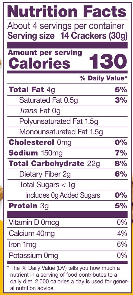 Crunchy, baked crackers with sesame, quinoa, flax and amaranth seeds with a rich and savory taste. Nutritional Info: Low in Saturated Fats, 0g Trans Fat, No Cholesterol Gluten Free Non-GMO Project Verified Kosher Dairy Contains 308 mg ALA Omega 3 per serving 21g Whole Grain per serving