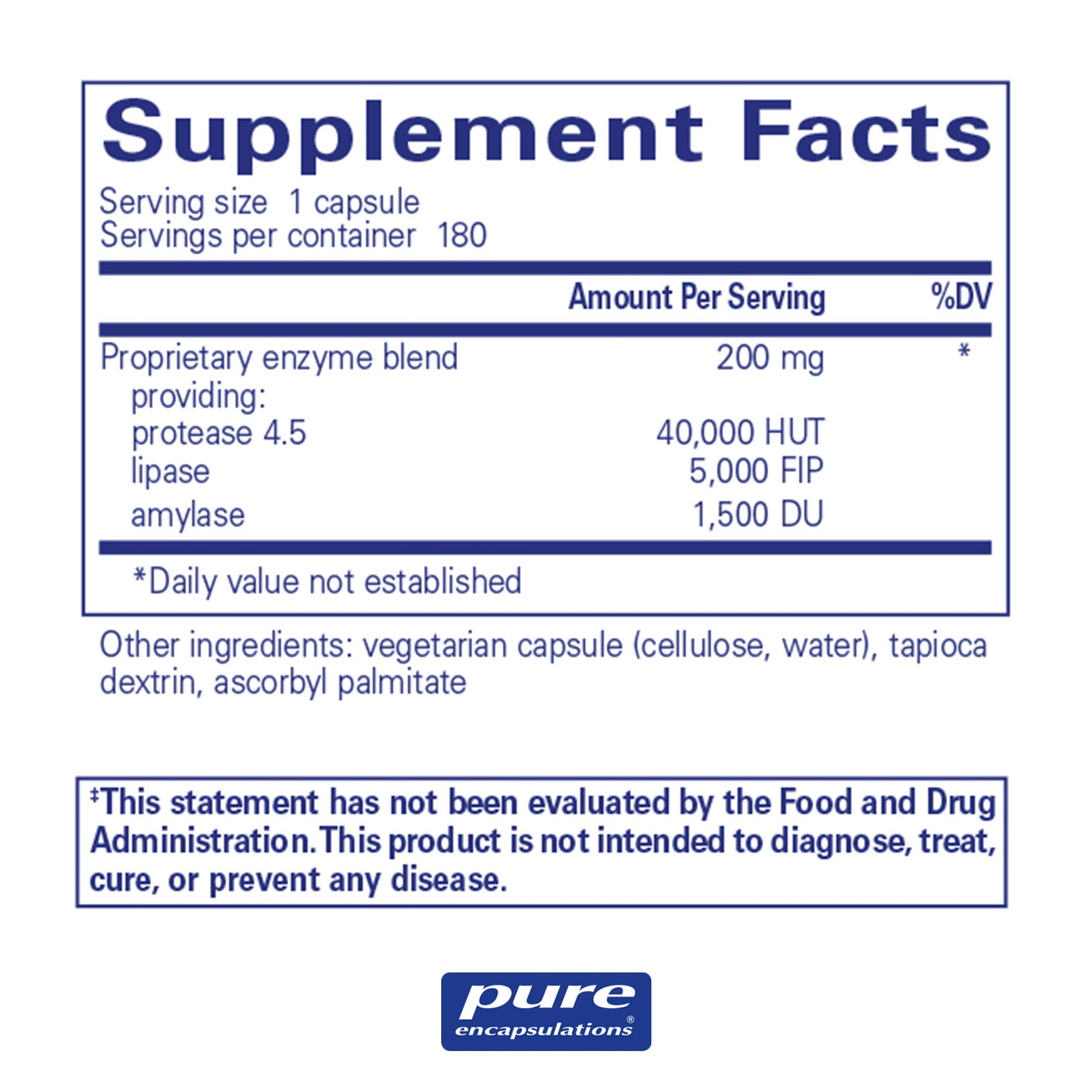 - Plant Based Enzymes: Pure Encapsulations Pancreatic VegEnzymes is comparable in amylase, protease and lipase profile to Pancreatic Enzyme Formula.