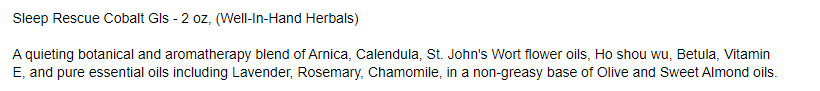 Let this natural, vegan, organic oil address the problems that keep you awake. Massage this pleasing formula into sore joints, smooth over your sunburn. Do your legs, the back of your neck, and anywhere you hold the tension of the day. Massage Sleep Rescue into your jaws if you grind your teeth at night!