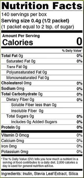 Other ingredients: Inulin, Stevia Leaf Extract, Silica