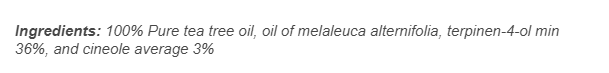 Ingredients: 100% Pure tea tree oil, oil of melaleuca alternifolia, terpinen-4-ol min 36%, and cineole average 3%