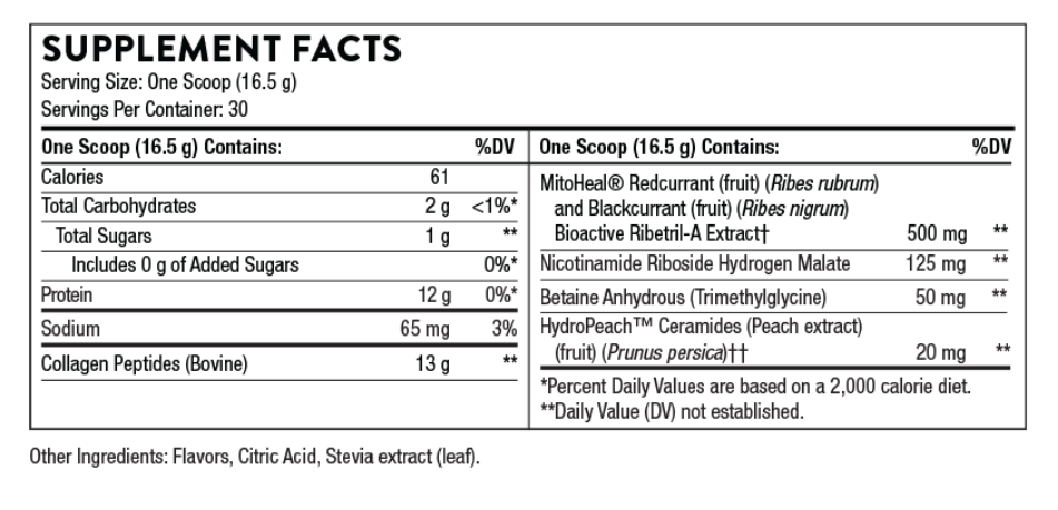 | MitoHeal® Redcurrant (fruit) (Ribes rubrum) and Blackcurrant (fruit) (Ribes nigrum) | 500 mg |