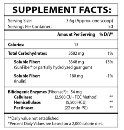 | Soluble Fiber (SunFiber® or partially hydrolyzed guar gum) | 3,348 mg | 13% |