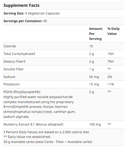 The combination of PGX® capsules and mulberry extract helps lower the glycemic index of your meals, slow glucose absorption and promote healthy blood sugar levels already in normal range. Incorporating PGX® into your diet will promote satiety, curb food cravings and normalize appetite and metabolism.